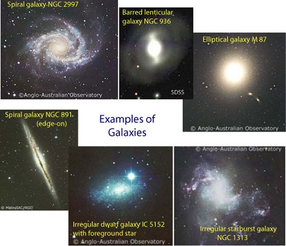 Οι γαλαξίες ταξινομούνται ανάλογα με το σχήμα τους. Ορισμένοι γαλαξίες ονομάζονται «σπειροειδείς», επειδή μοιάζουν με γιγάντιους ανεμόμυλους στον ουρανό. Ο γαλαξίας στον οποίο ζούμε, ο Γαλαξίας Milky Way, είναι σπειροειδής γαλαξίας. Ορισμένοι γαλαξίες ονομάζονται «ελλειπτικοί», επειδή μοιάζουν με επίπεδες μπάλες. Ένας γαλαξίας μπορεί να ονομάζεται «ακανόνιστος» αν δεν έχει πραγματικά συγκεκριμένο σχήμα. Ένας νέος τύπος γαλαξία ανακαλύφθηκε πρόσφατα, που ονομάζεται «γαλαξίας εκρηκτικής γένεσης άστρων» (starburst). Σε αυτόν τον τύπο γαλαξία, νέα άστρα φαίνεται να «ξεπηδούν» πολύ γρήγορα.